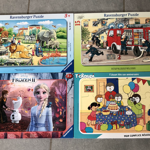 Nous achetons principalement 2 marques de puzzles ces temps-ci: Nathan et Ravensburger. Nous prenons des puzzles 15 pièces avec un cadre. L'avantage des puzzles Nathan est qu'il y a l'image en fond qui guide l'enfant. Les puzzles Ravensburger n'ont pas l'image en fond mais ont la forme des pièces. Serena arrive déjà à en faire plusieurs toute seule et ça l'occupe pendant un bon moment.